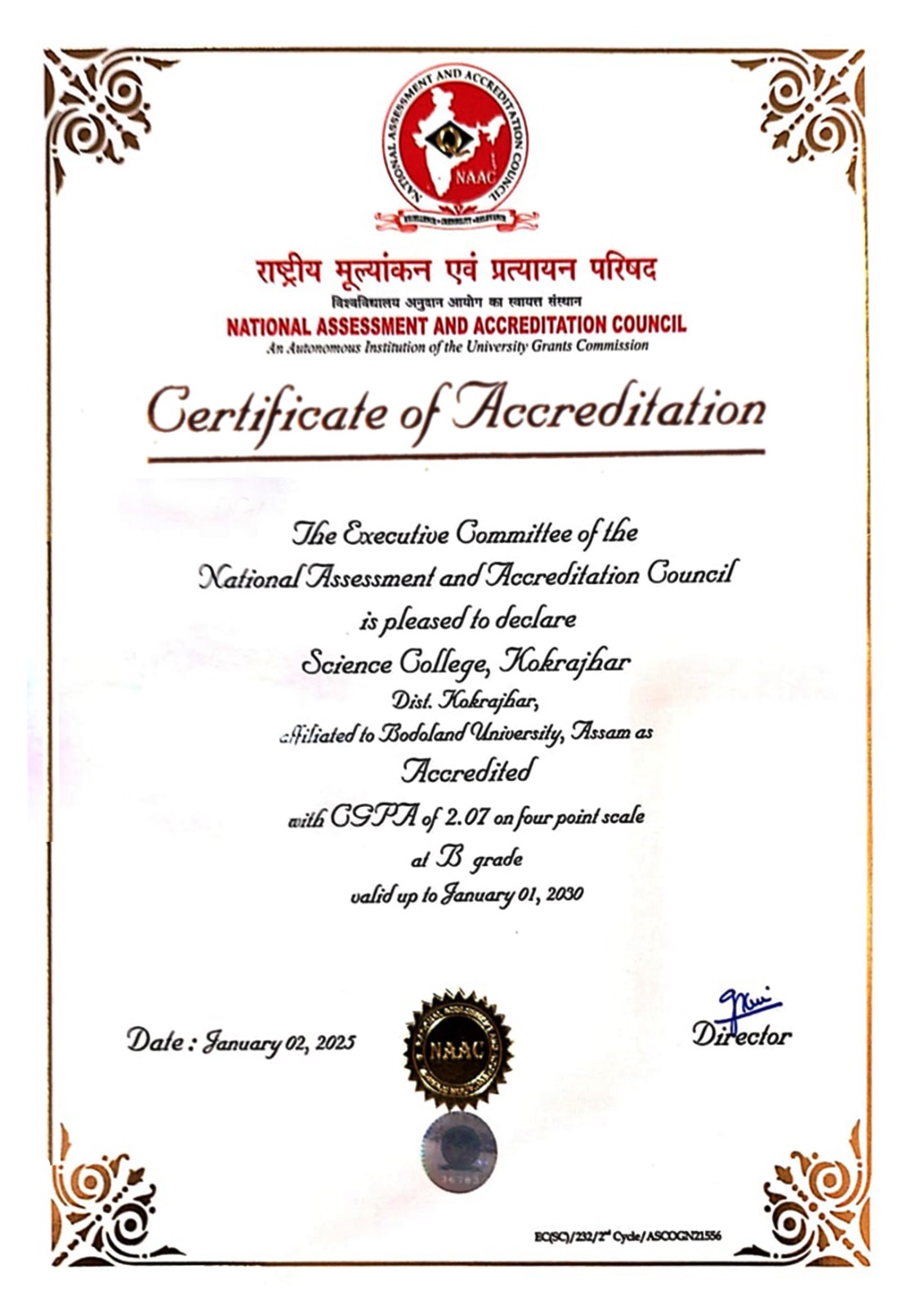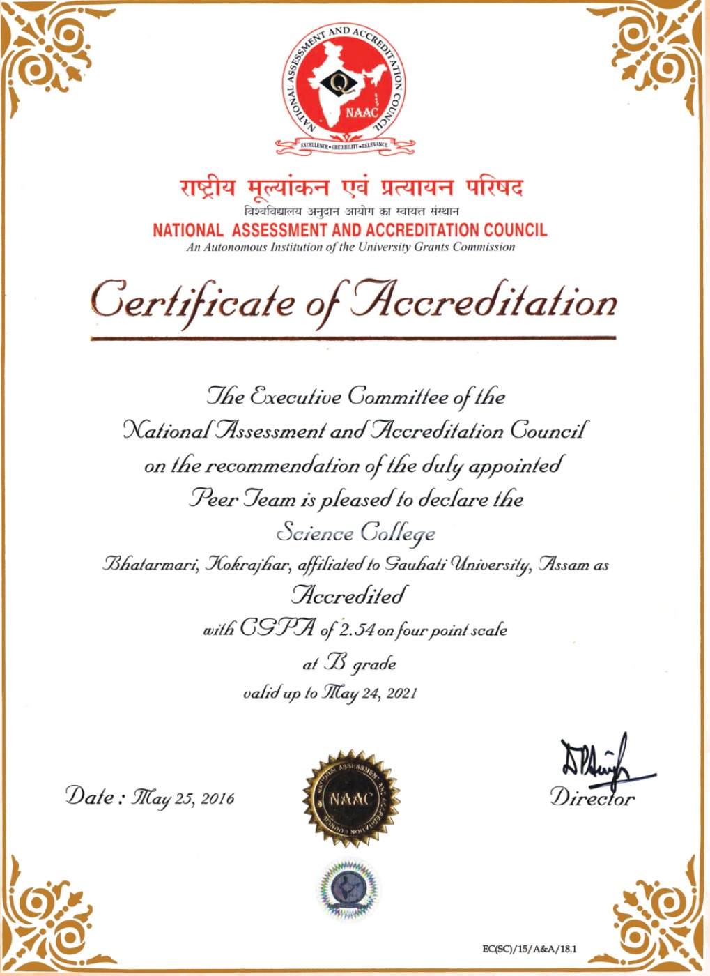 The College is Accredited with "B" grade by NAAC (Cycle-1), CGPA-2.54 View Certificate